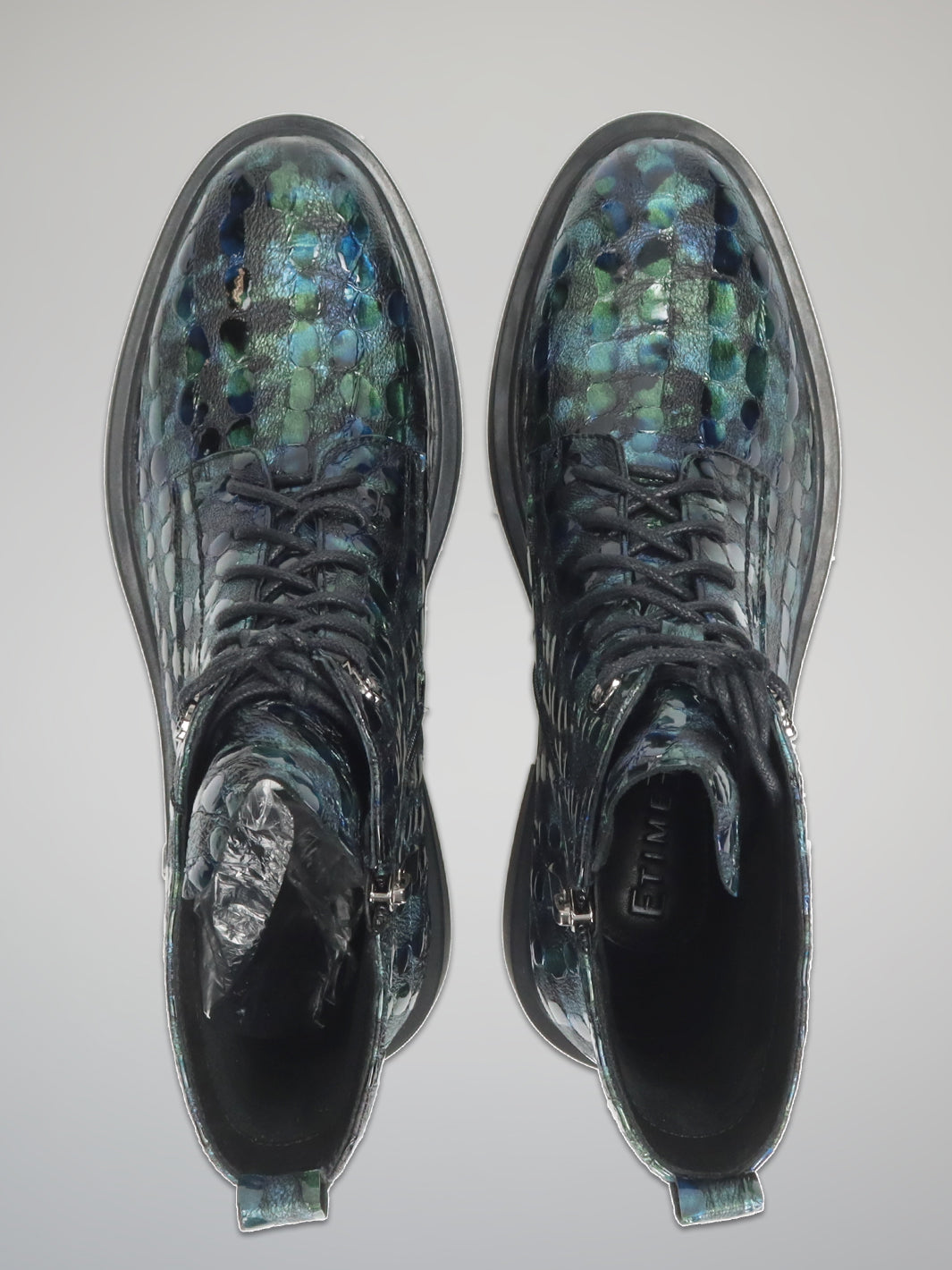 ETIMEĒ ankle boots in an extraordinary green design will become the highlight of Your seasonal wardrobe. Their unique textured surface with a shimmering mosaic effect combines elegance with bold fashion flair. The ankle-high cut adds refinement while ensuring comfort in every step. Whether You style them with casual trousers or a chic dress, these boots will instantly elevate Your outfit with confidence and originality.