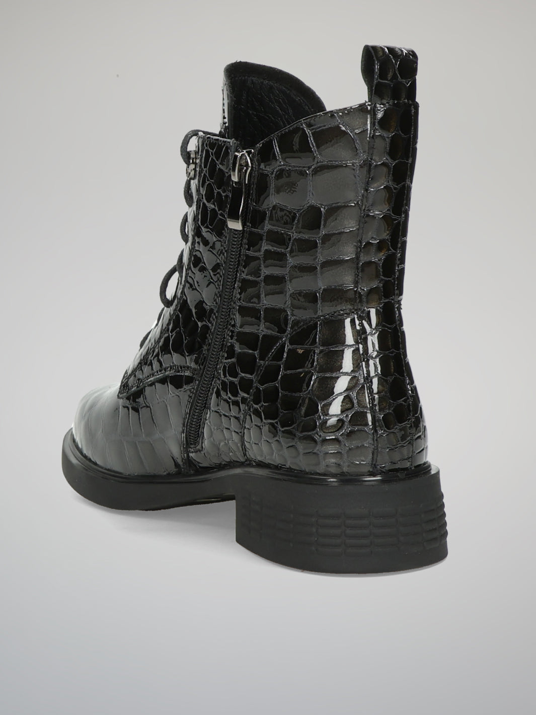 ETIMEĒ ankle boots in black patent leather offer an irresistible mix of bold design and timeless elegance. The crocodile effect texture makes every step a true statement of individuality, while the glossy surface adds refinement and modern appeal. Thanks to their lace-up style with a practical side zip, You enjoy both comfort and effortless wear. These ankle boots are the perfect partner for sophisticated city outfits and give Your wardrobe a confident, fashion-forward edge.
