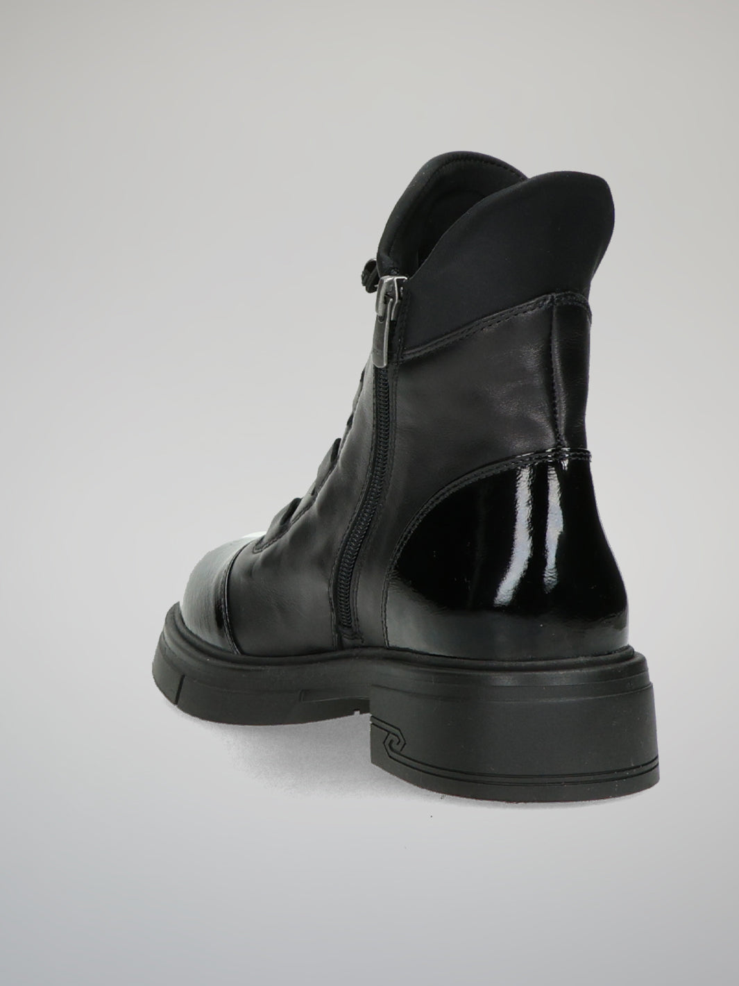 These black leather ankle shoes combine urban edge with refined sophistication. The sleek matte texture contrasts beautifully with the glossy patent details, creating a bold yet elegant statement. A unique diamond-shaped embellishment and modern lace design add a touch of individuality and luxury. Perfect for confident women who value both comfort and contemporary style in their everyday look.