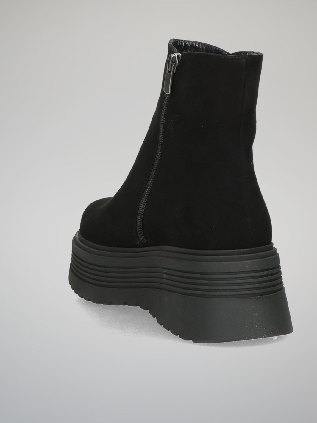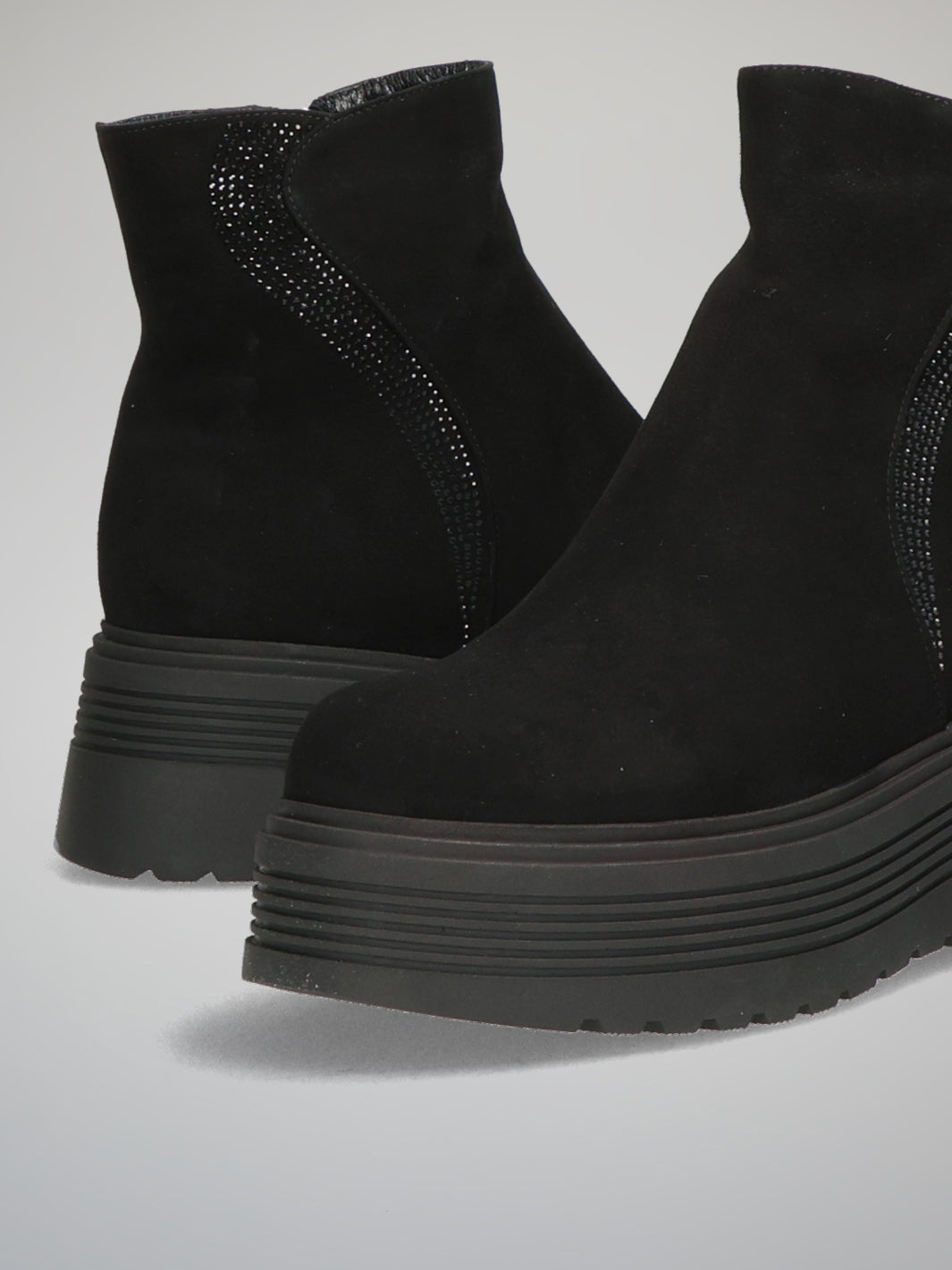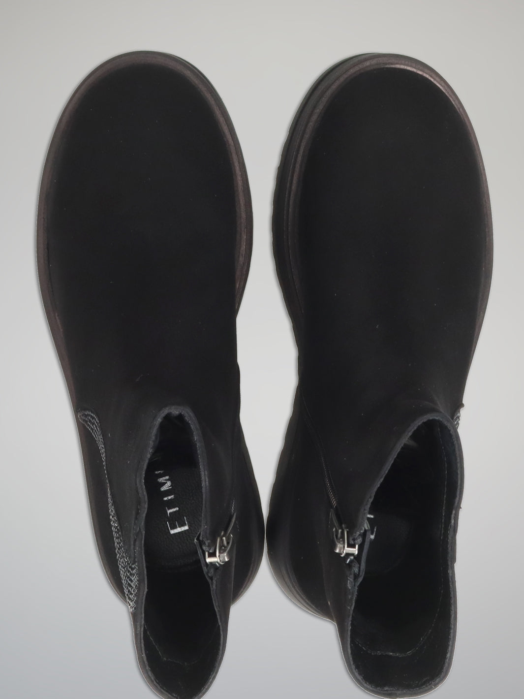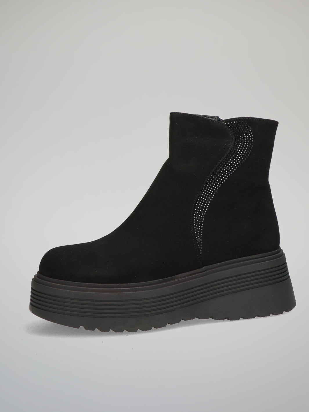 Discover the perfect fusion of elegance and comfort with these ETIMEĒ black ankle boots. Crafted from soft nubuck leather, they enchant with their minimalist silhouette and subtle rhinestone detail that adds a hint of sparkle to every step. The high platform sole gives you extra height while ensuring exceptional stability and comfort. With a cozy textile lining and practical side zip, these boots will keep your feet warm and stylish throughout the colder months. Pair them effortlessly with jeans or dresses — they’re the perfect choice for both casual days and chic evenings.