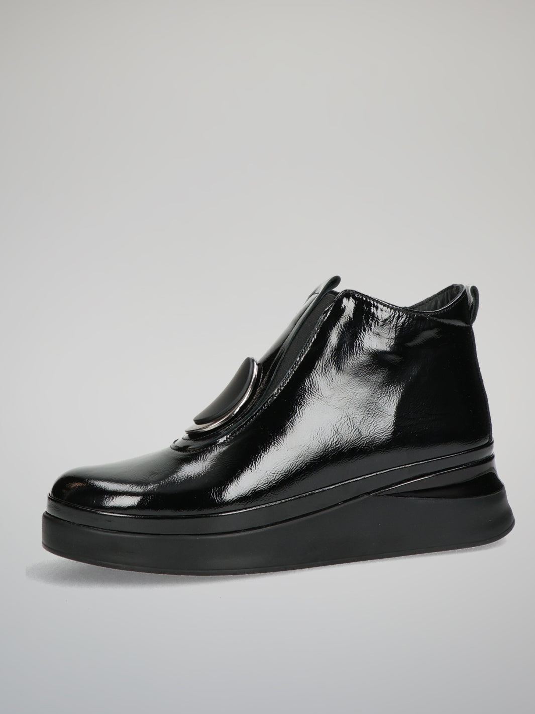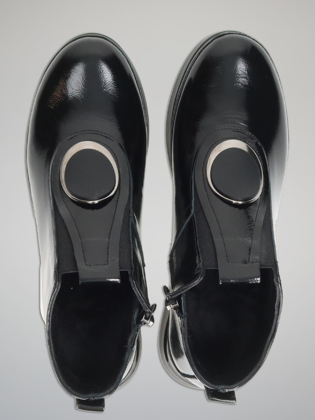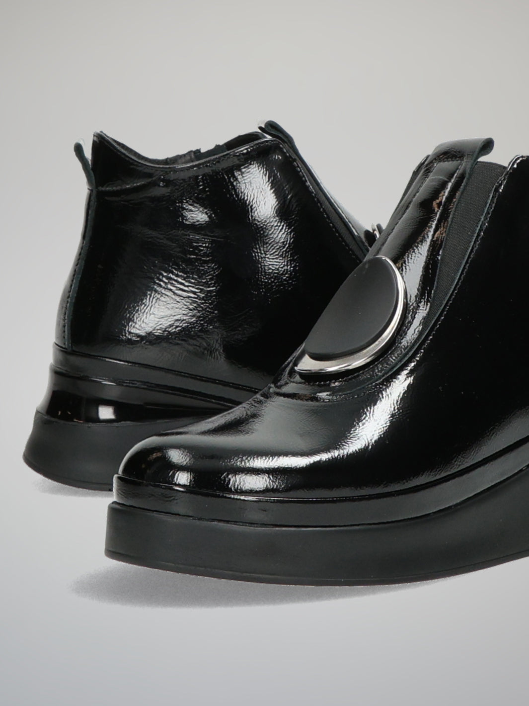 Step into modern elegance with these ETIMEĒ black patent leather ankle shoes that blend high fashion with everyday comfort. The glossy finish and bold decorative detail on the front make them an eye-catching statement piece. Designed with a soft textile lining and a practical zip fastening, they offer all-day coziness while keeping your look polished and sophisticated. The lightweight platform sole adds subtle height and ensures a smooth, confident stride. Perfect for pairing with sleek trousers or casual dresses, these shoes will elevate your outfit effortlessly — from day to night.