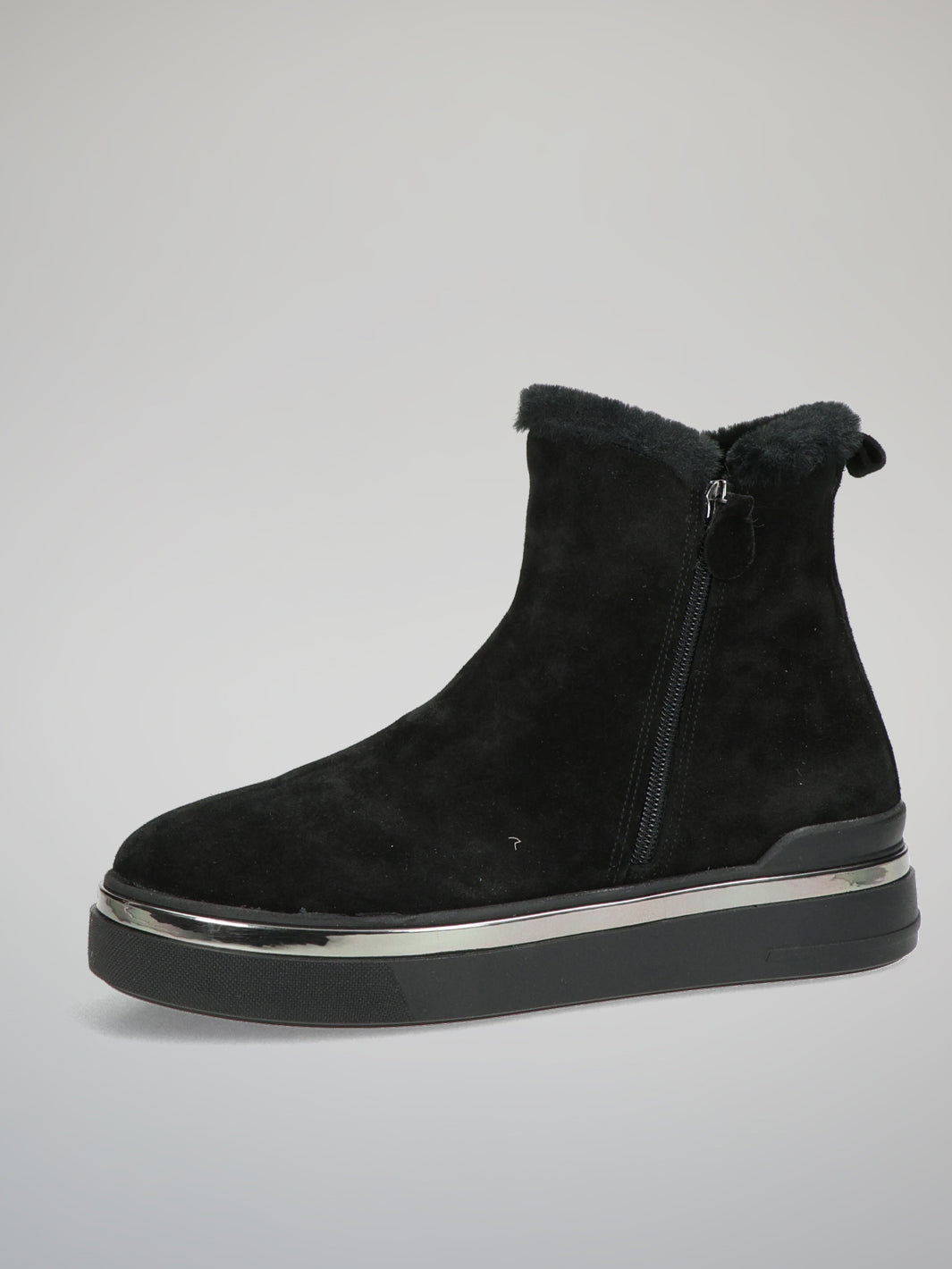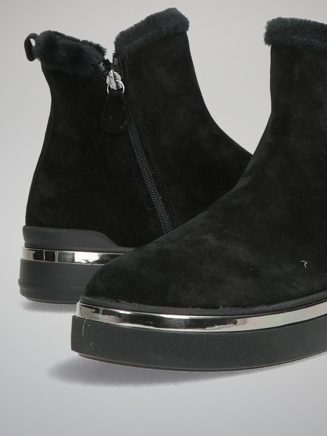Discover effortless elegance with these ETIMEĒ black suede ankle boots, designed to keep you warm and stylish all season long. Crafted from soft suede leather, they offer a luxurious touch while ensuring lasting comfort. The warm inner lining and easy zip fastening make them perfect for chilly days when you want both coziness and convenience. Their sleek silhouette with a subtle metallic detail adds a modern edge to any outfit. Ideal for pairing with jeans, skirts, or casual dresses, these boots are your go-to choice for everyday sophistication.