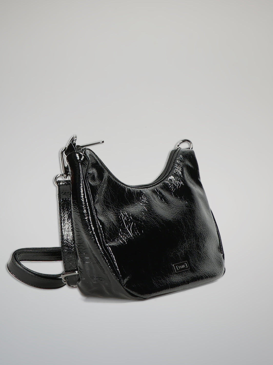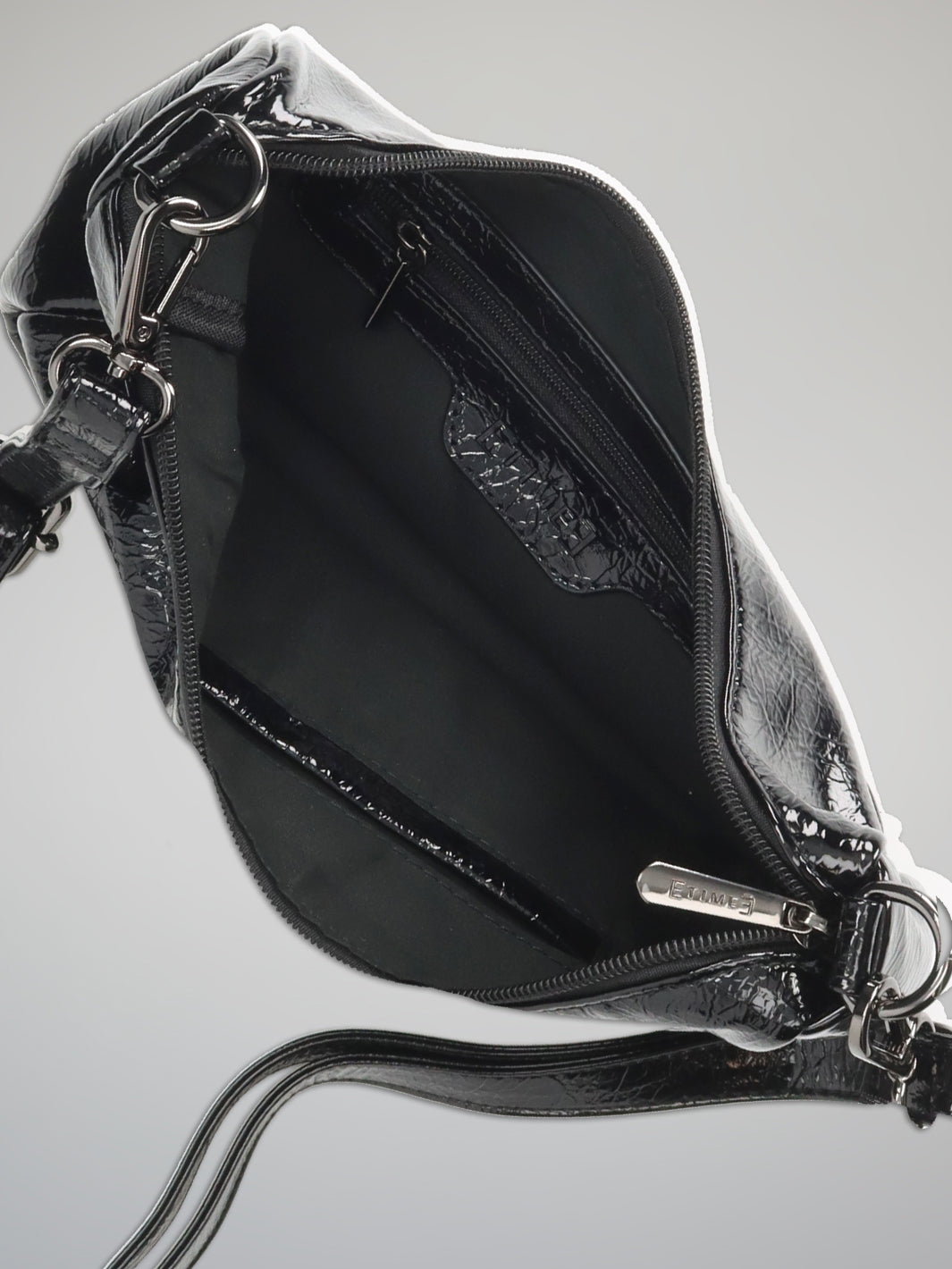 Elegant, timeless, yet distinctive — this black patent handbag is the perfect accessory for the modern woman who knows what suits her. Its glossy finish instantly catches the eye and adds a touch of luxury to any outfit. The practical zippered interior offers ample space for all Your daily essentials. With an adjustable shoulder strap, You can wear it comfortably on the shoulder or crossbody. A perfect choice for work, shopping, or an evening out with friends.