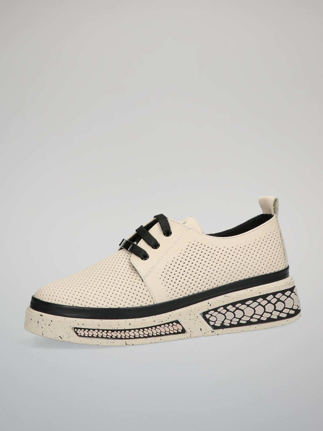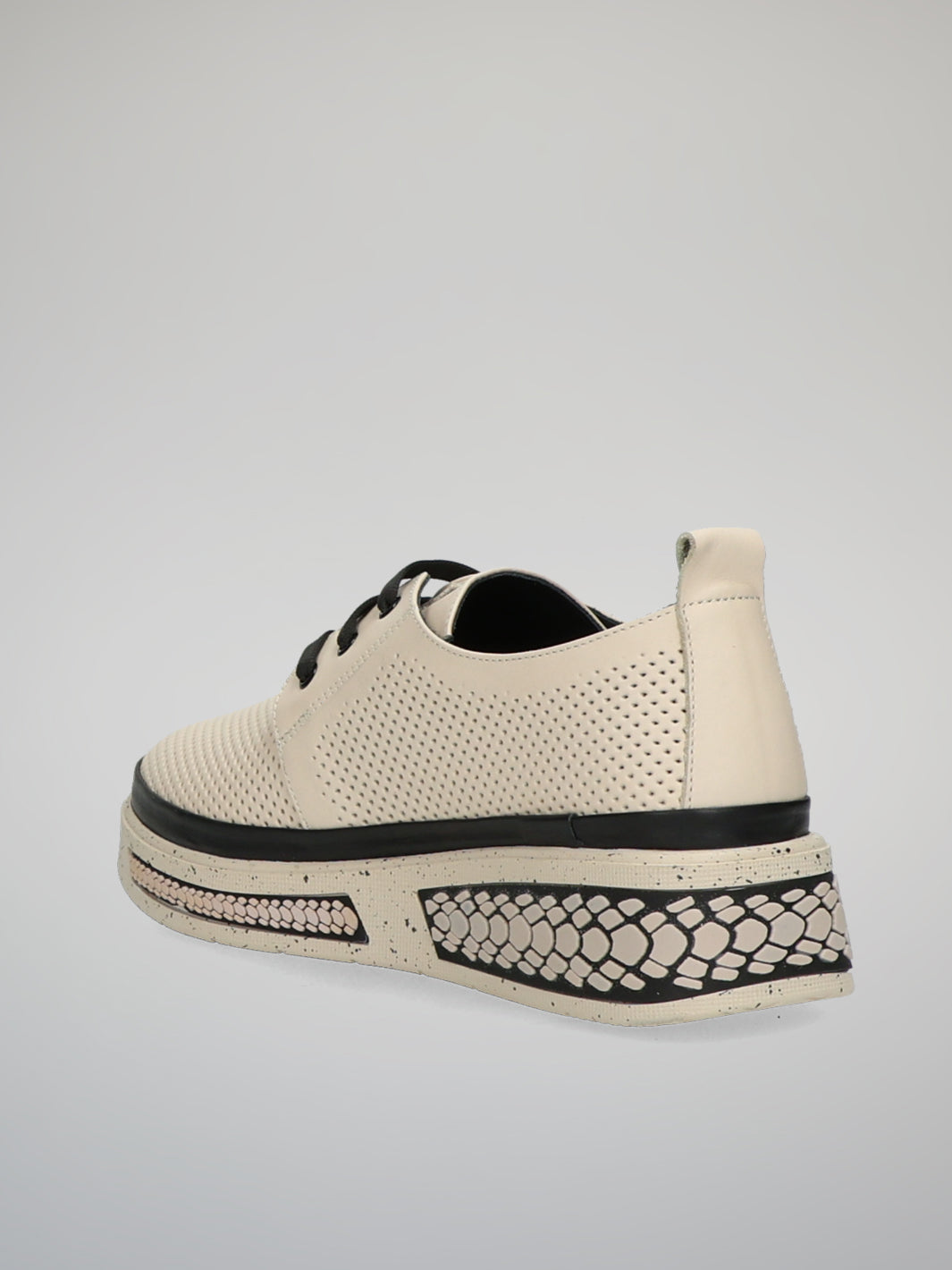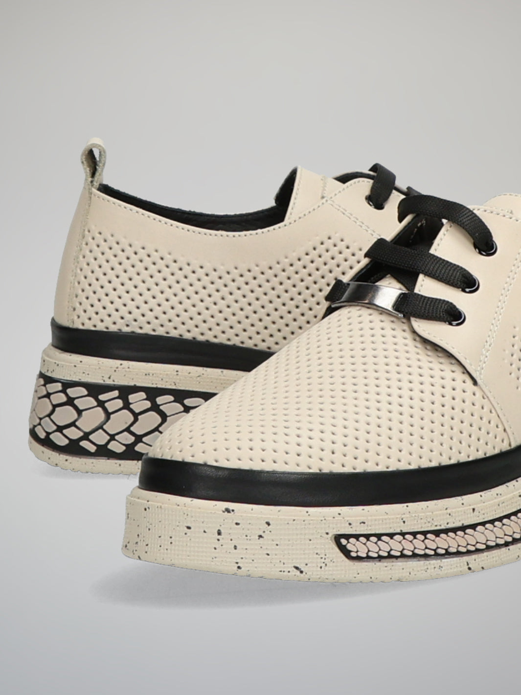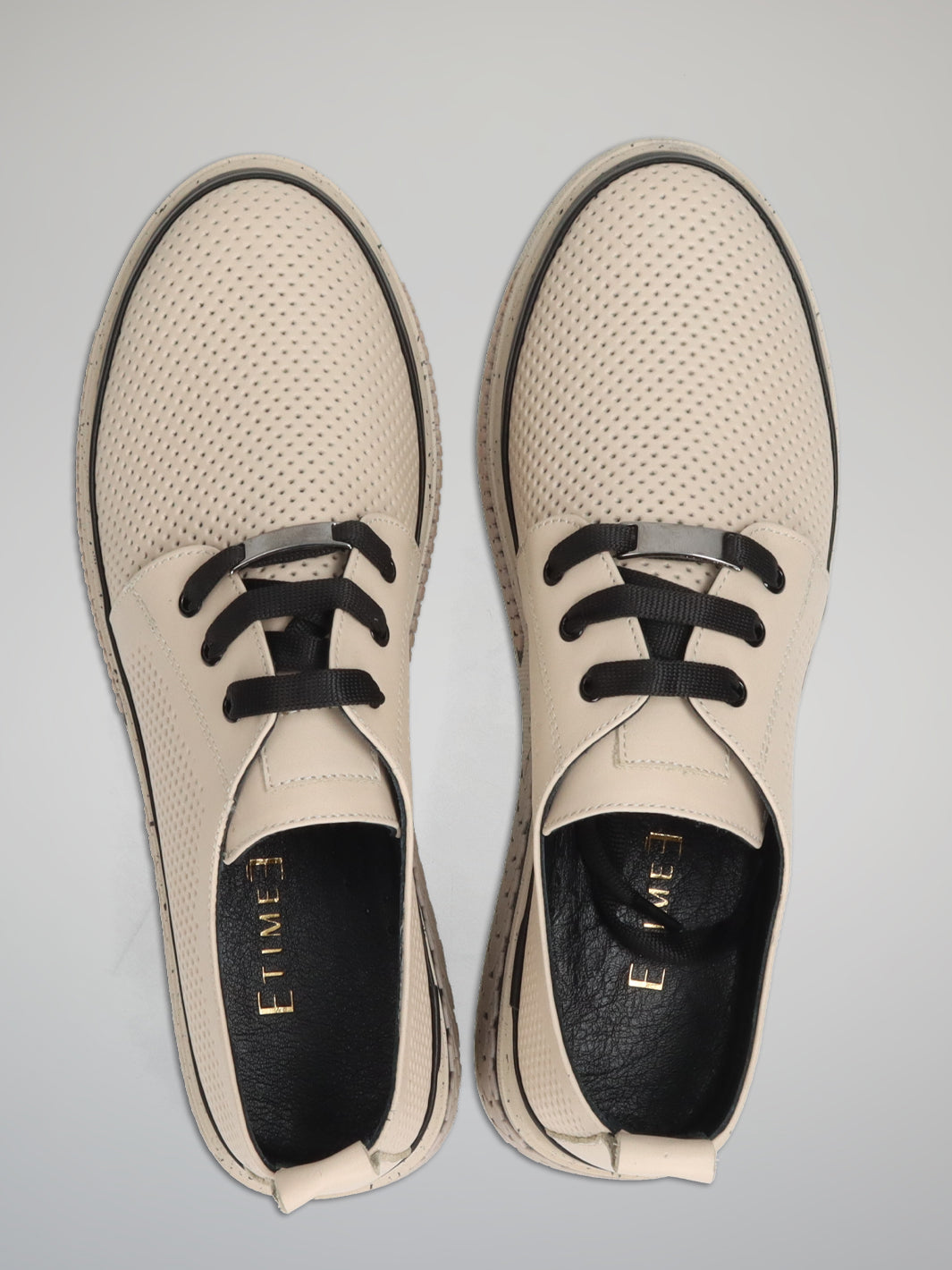 Redefine everyday elegance with these ETIMEĒ beige leather low shoes, where soft neutrals meet bold design. The delicate perforated finish adds a refined lightness, while contrasting black laces create a modern, eye-catching accent. Set on a distinctive sculpted sole with artistic detailing, they bring a fashion-forward twist to a timeless silhouette. Perfect for elevating minimalist outfits, tailored sets or relaxed denim, they transition effortlessly from workdays to weekend outings. A sophisticated choice for women who love subtle tones with a confident edge.