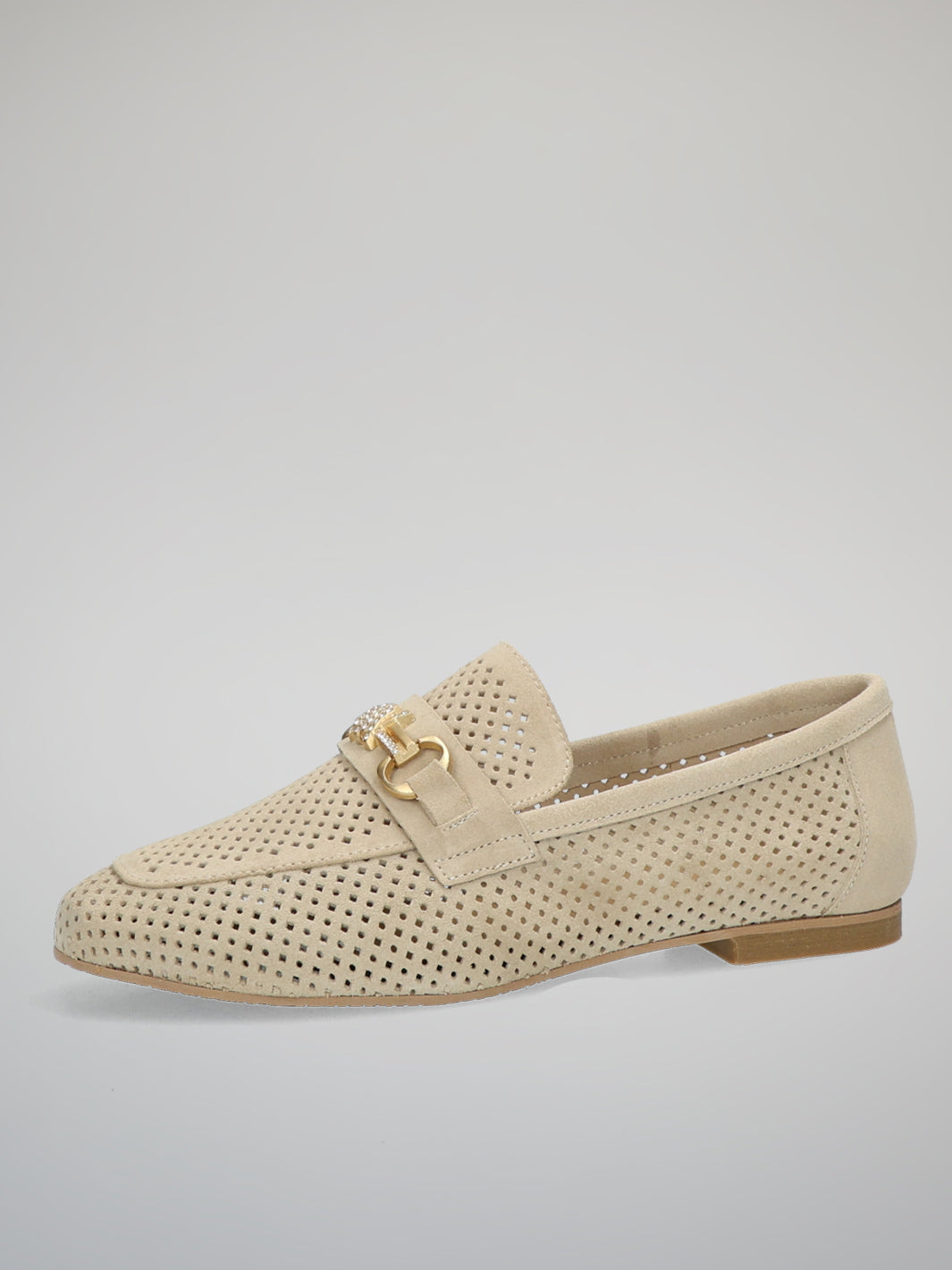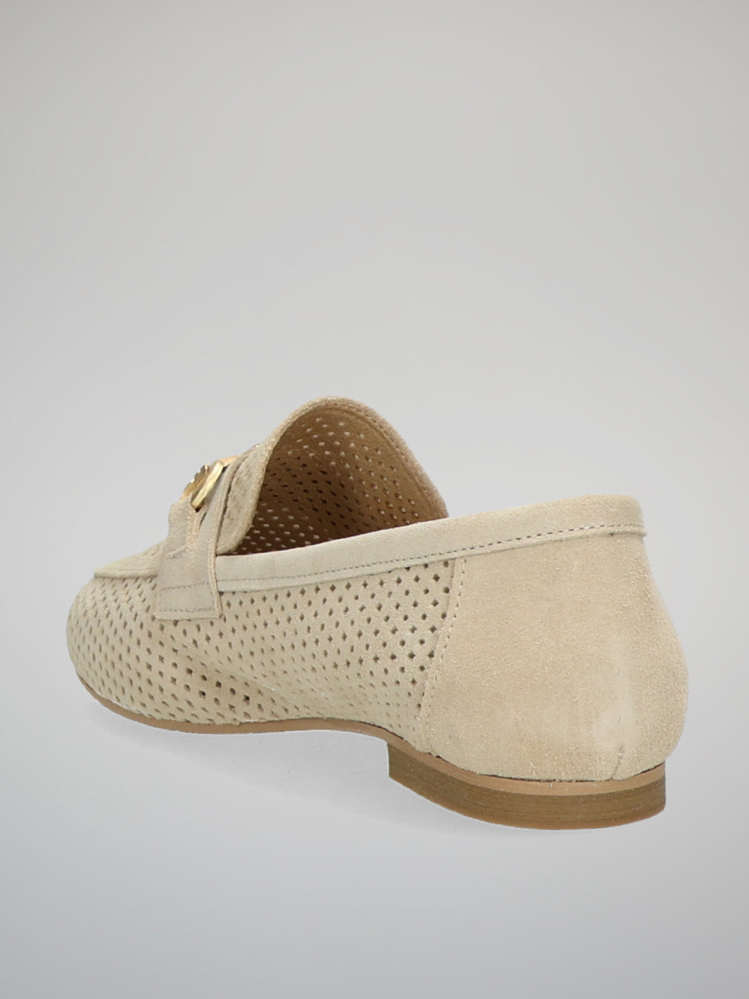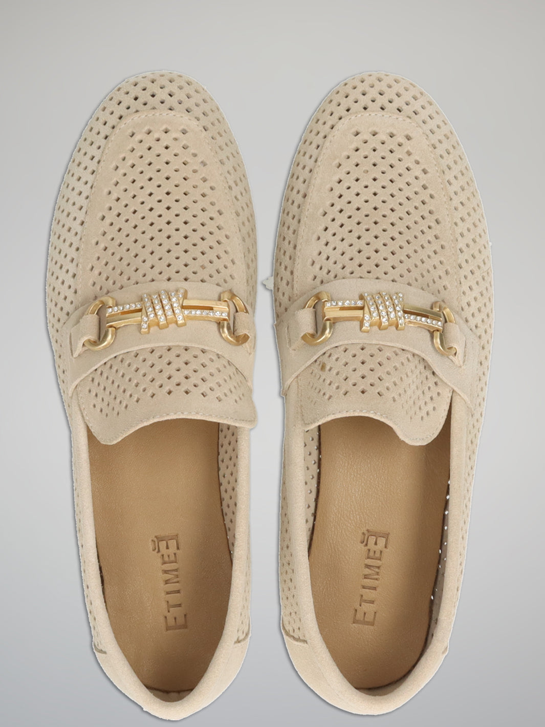 Light, elegant and effortlessly refined, these ETIMEĒ perforated moccasins bring timeless charm to everyday styling. The soft beige tone creates a clean, sophisticated look, while the delicate perforated pattern adds an airy, feminine touch. A polished gold accent across the front elevates the design with subtle luxury. Perfect for warm days, city strolls or relaxed office outfits, they pair beautifully with both casual and smart looks. A graceful choice for women who appreciate comfort blended with understated elegance.