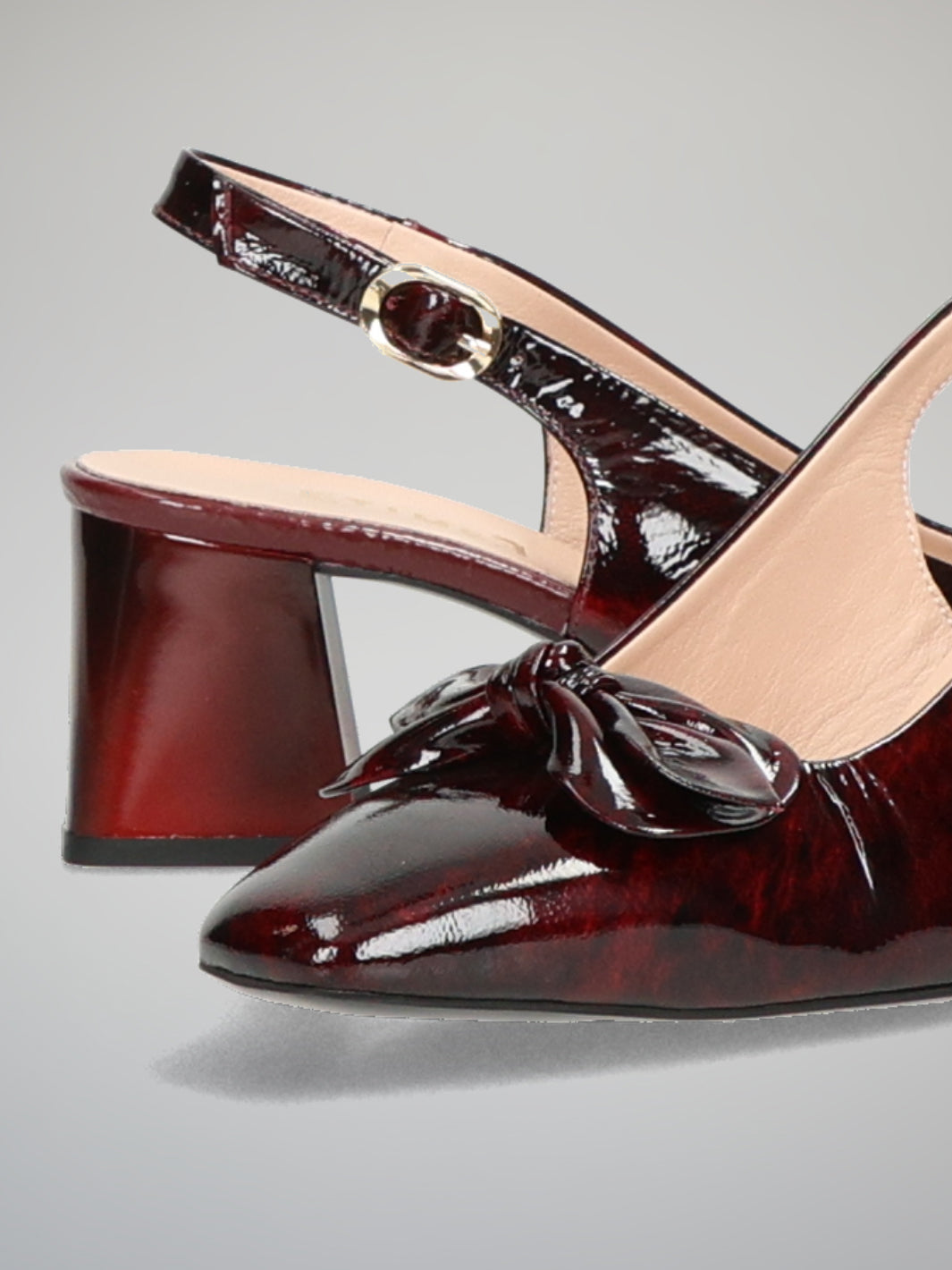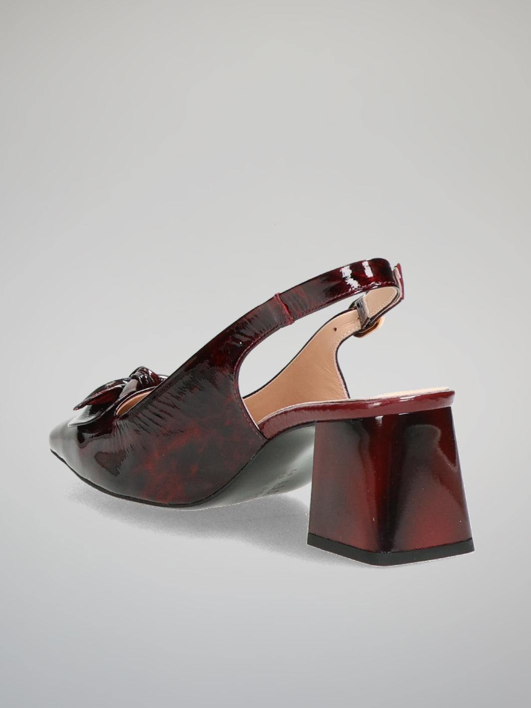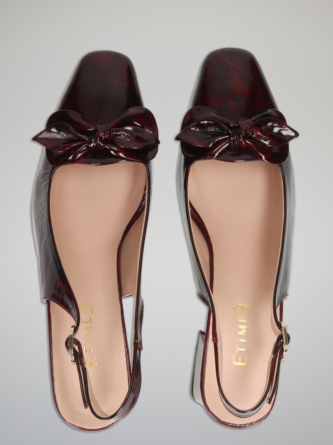 Sophisticated and striking, these ETIMEĒ open-heel pumps in deep burgundy bring timeless elegance with a modern twist. The glossy finish beautifully highlights the rich color, creating a luxurious look that instantly elevates any outfit. A delicate bow detail on the front adds a graceful, feminine accent, while the sleek silhouette keeps the design refined and polished. Perfect for evening events, elegant dinners, or adding a statement touch to a chic daytime look. With every step, they capture confidence, style, and understated glamour.