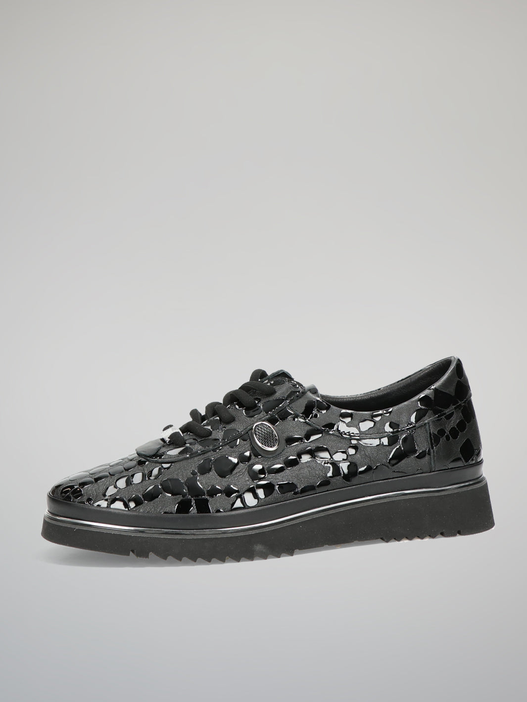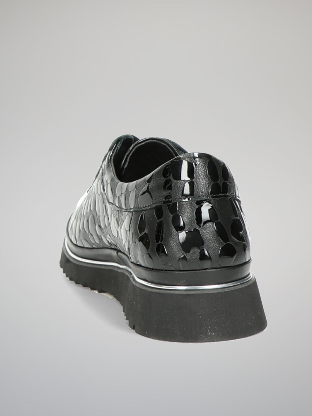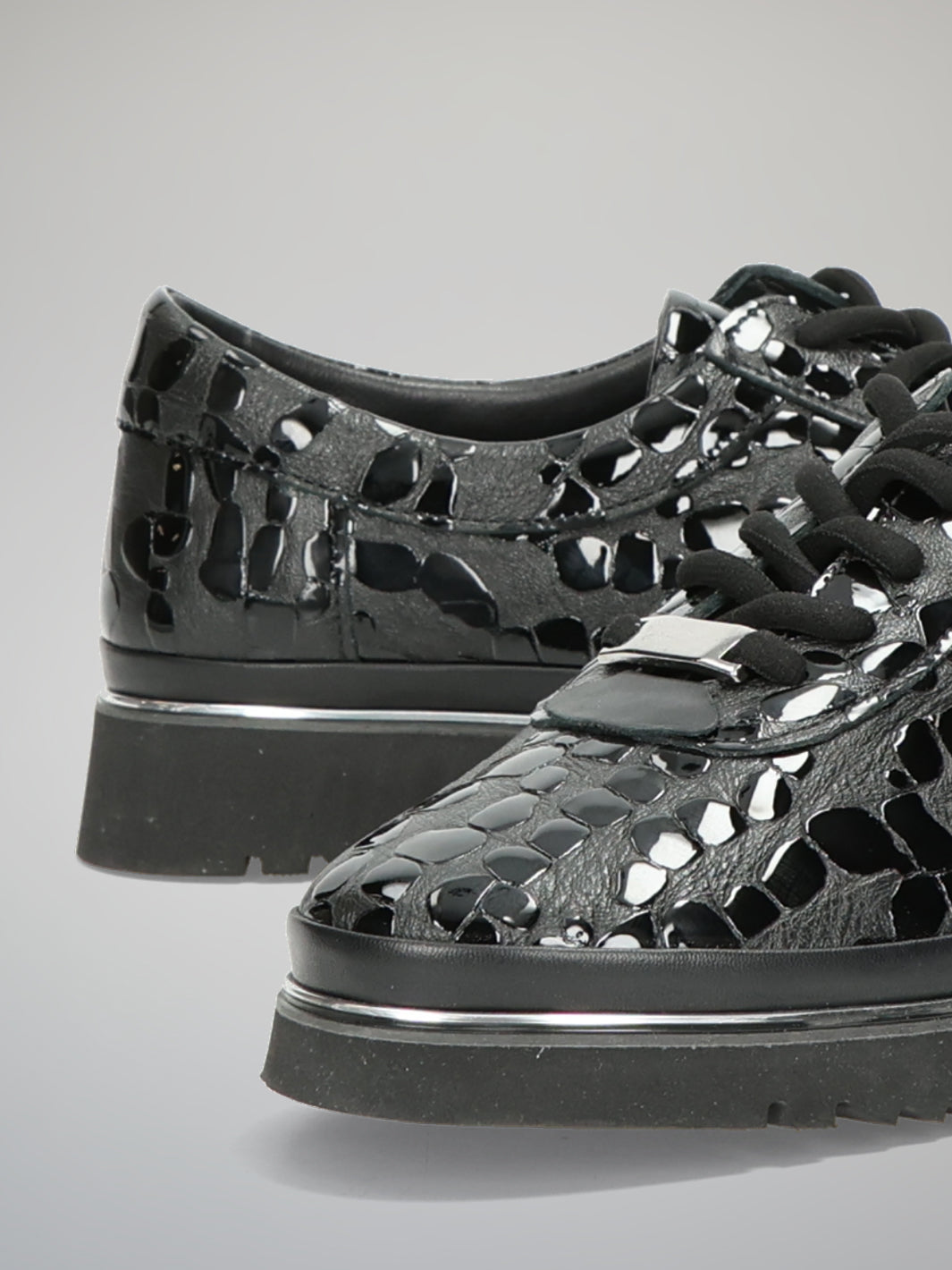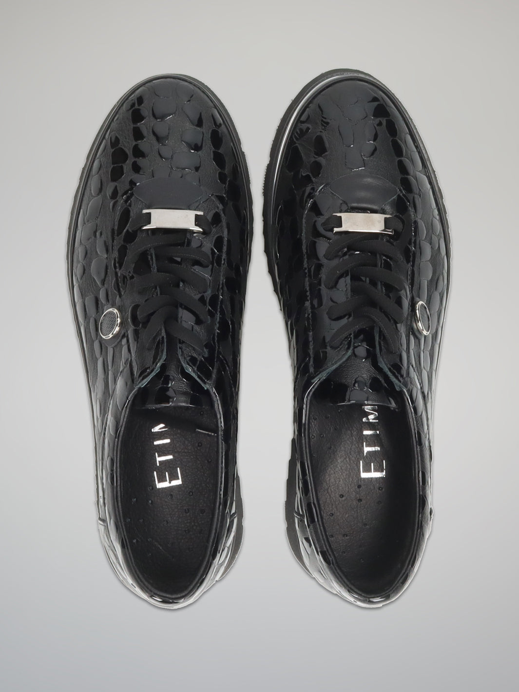 Choose both style and comfort with ETIMEĒ women’s leather sneakers in black. The glossy patent upper with a modern pattern gives the shoes a unique look that instantly stands out. A stable platform and premium leather lining ensure comfort with every step. The lace-up design adapts perfectly to the shape of Your foot, providing all-day ease. These sneakers are the ideal choice for women seeking a blend of casual elegance and practical everyday wear.