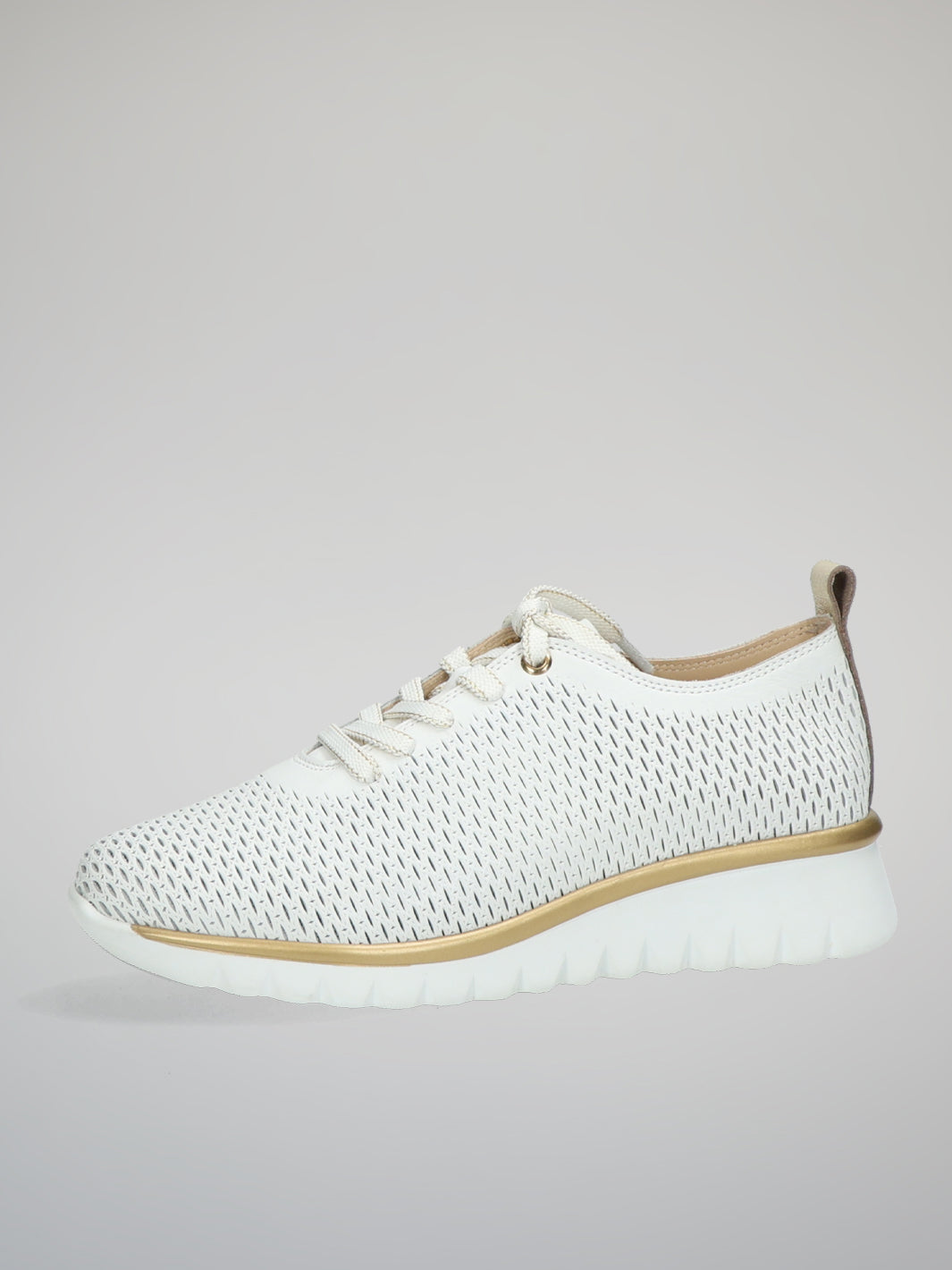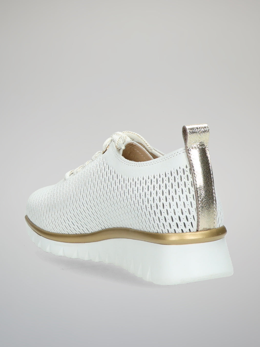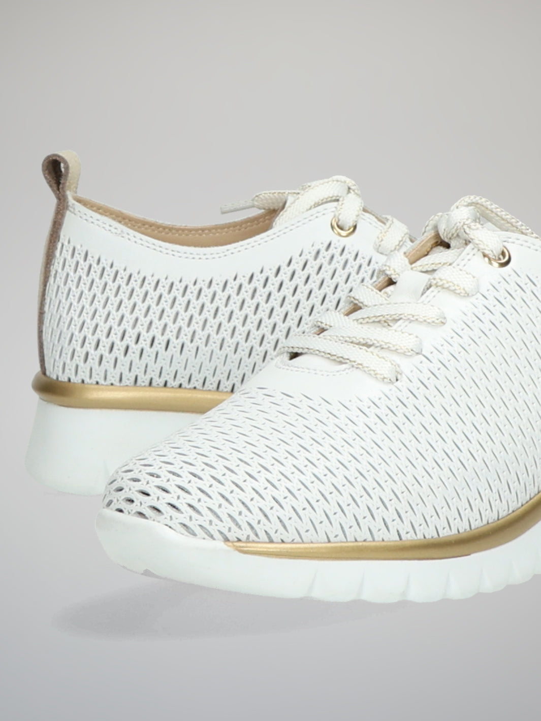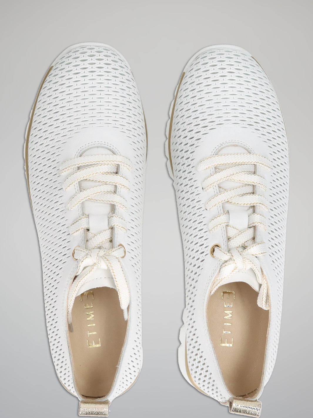 Step into fresh, effortless style with these ETIMEĒ white everyday sneakers. The delicately perforated design gives them a light, airy look, while subtle gold accents add a refined touch of elegance. Their clean silhouette makes them incredibly versatile, perfect for pairing with relaxed denim, summer dresses or casual office outfits. Designed for women who value both comfort and style, they bring a polished finish to any everyday look. A timeless choice that keeps your outfit bright, modern and beautifully feminine.