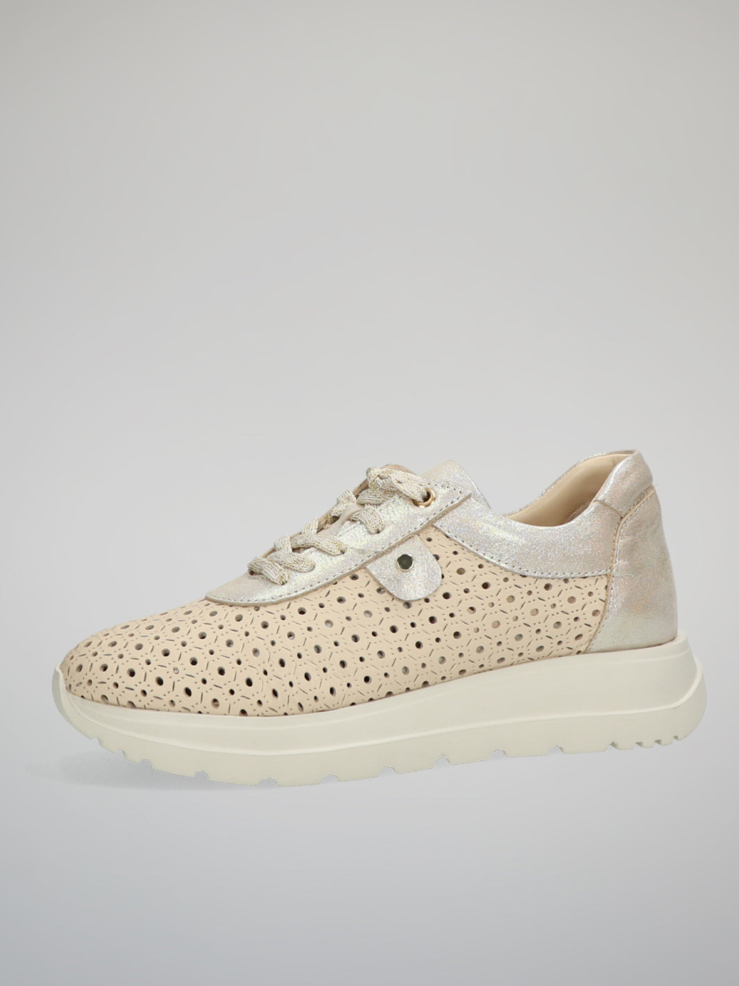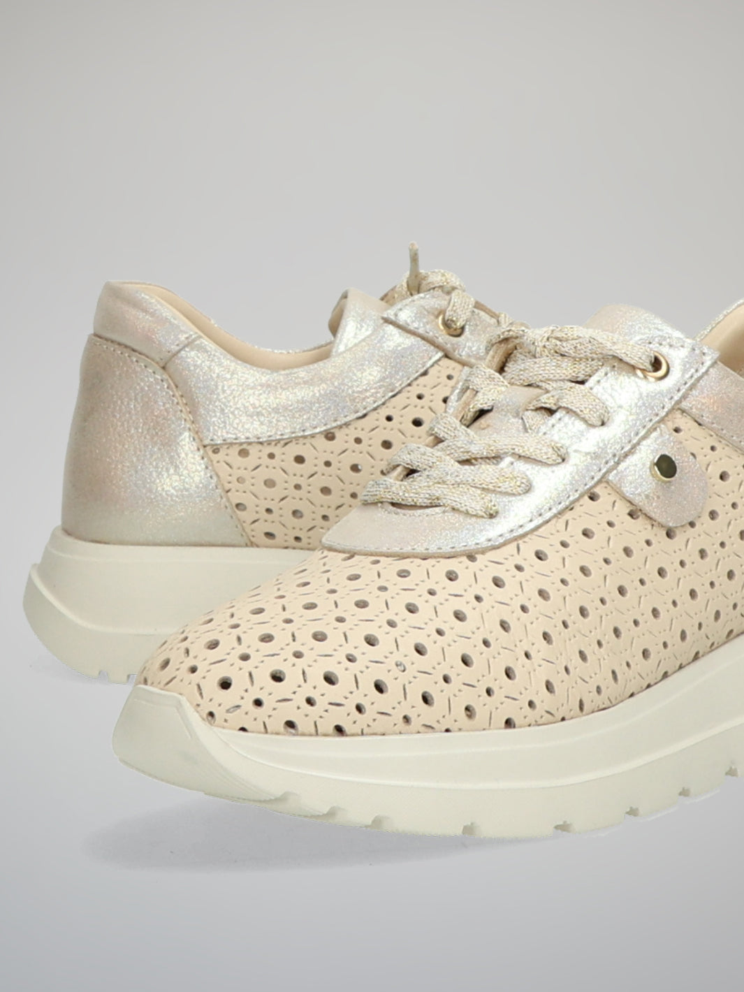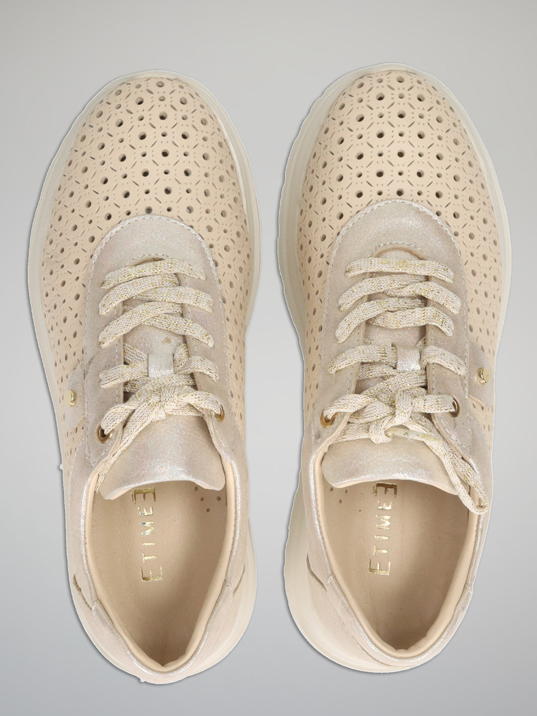 Fresh, feminine and effortlessly chic, these ETIMEĒ sneakers bring a refined touch to everyday style. The delicate perforated pattern creates a light and airy look, while soft beige tones are beautifully enhanced by subtle gold details. Their elegant yet relaxed design makes them easy to pair with everything from casual denim to flowing summer dresses. Perfect for city strolls, travel days or relaxed weekends, they add a polished finish to any outfit. A stylish choice for women who love comfort with a hint of understated glamour.