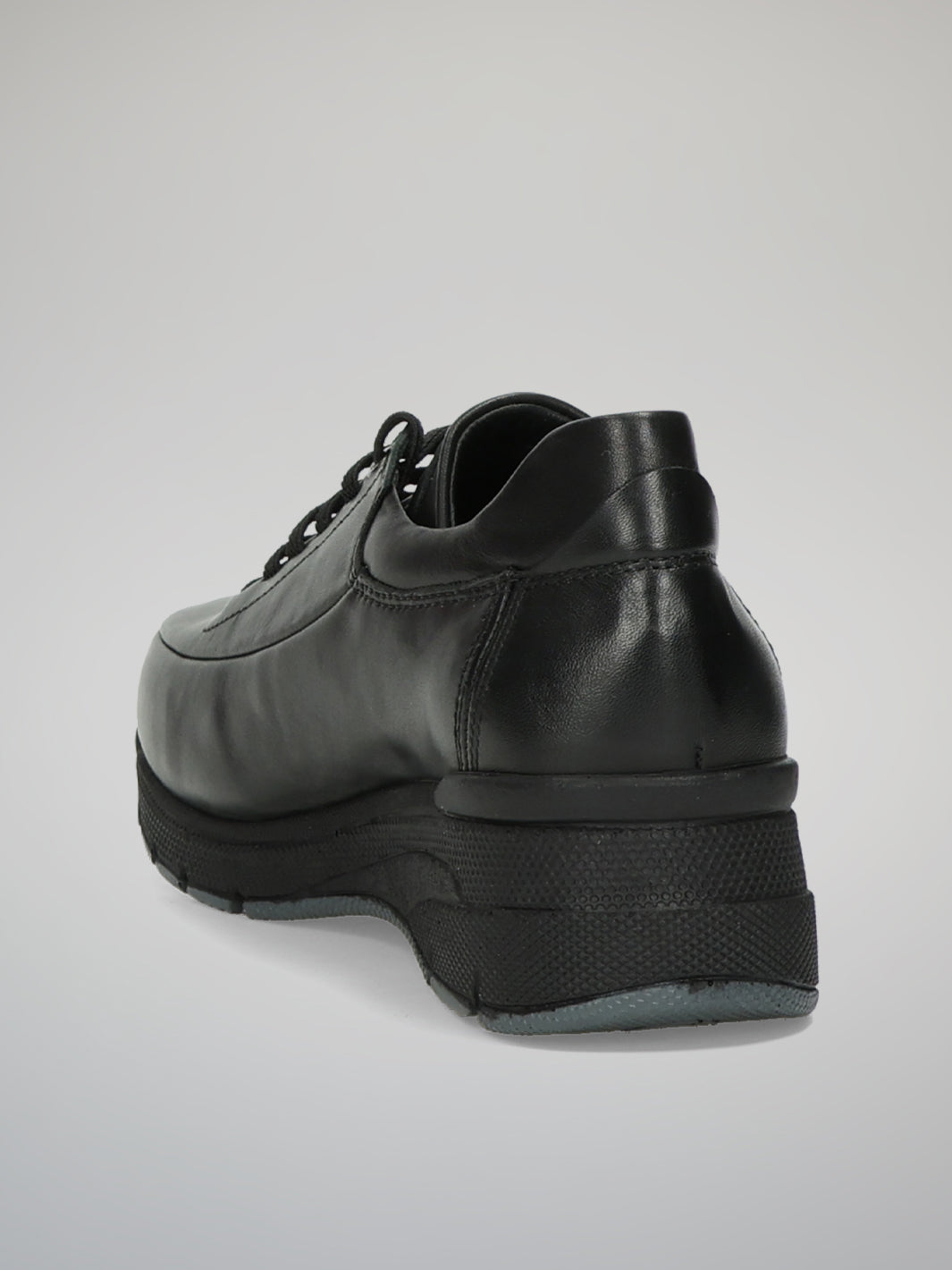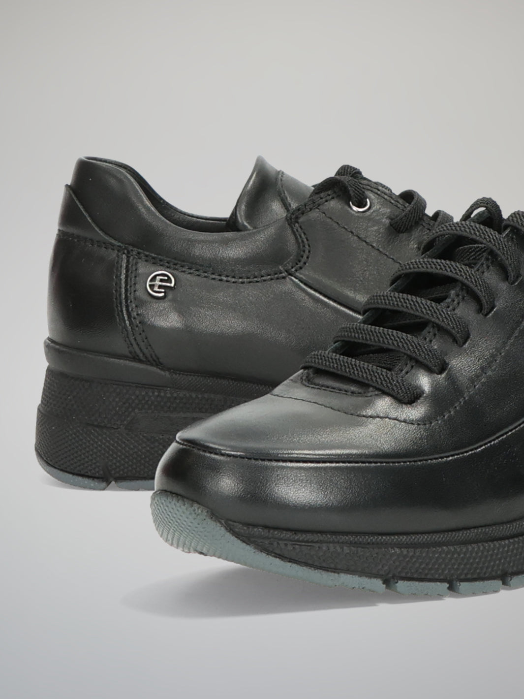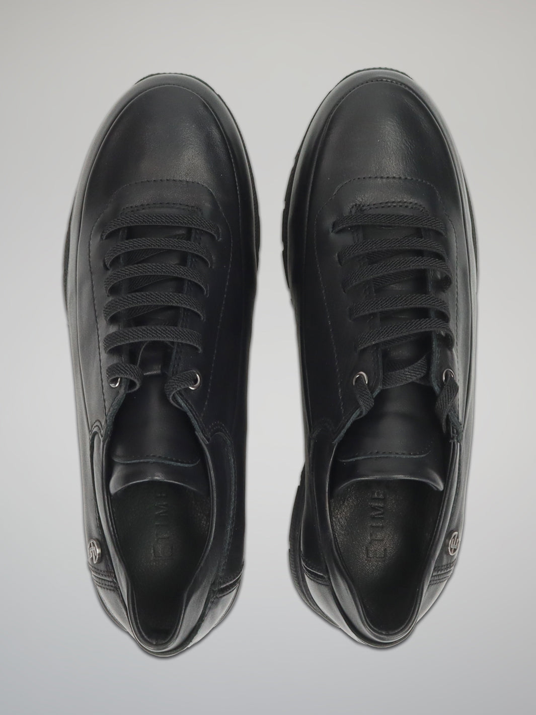 Enjoy the perfect blend of comfort and style with ETIMEĒ women’s leather trainers in black. Their elegant design pairs effortlessly with both casual and urban outfits, while premium leather ensures durability and comfort with every step. A slightly elevated sole adds height while providing stability throughout the day. Thanks to the lace-up closure, they adapt perfectly to Your foot for maximum ease. Ideal for women seeking stylish everyday footwear.